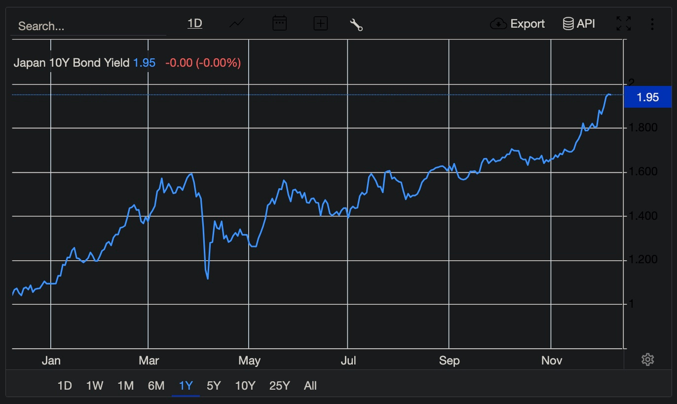 The highest yield-1.94%- on Friday. The yield spike in Japan could trigger a crisis in global interest rates. (i.e. be a VERY BIG DEAL!).