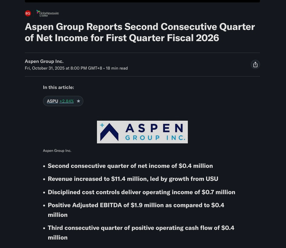 LINK to Aspen: https://finance.yahoo.com/news/aspen-group-reports-second-consecutive-120000813.html