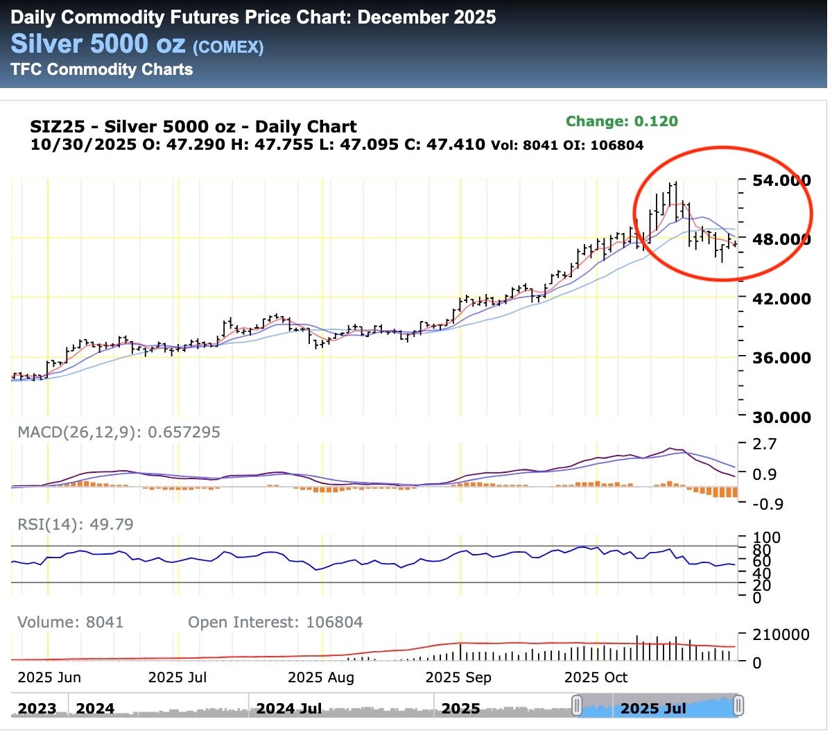 Silver, for the past couple weeks, has experienced a significant drop in price from $53 to $45: