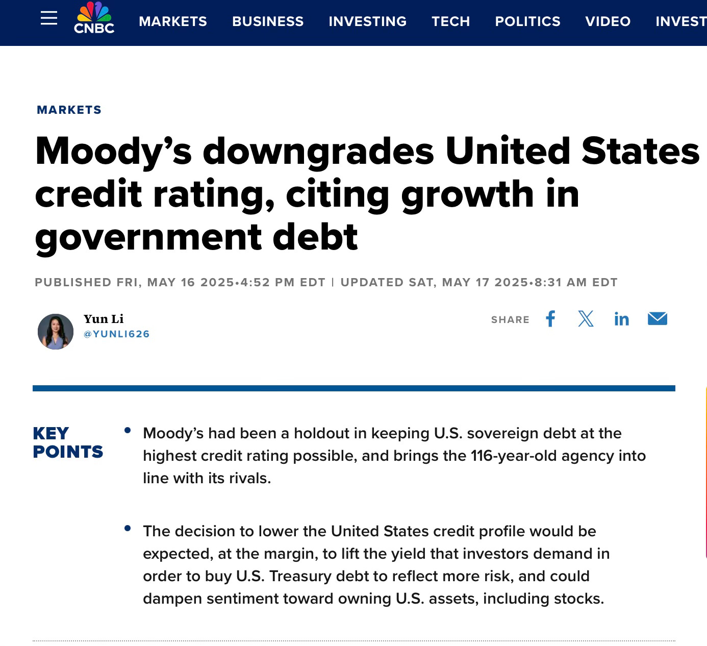 Moody’s Ratings cut the United States’ sovereign credit rating one notch to Aa1 from Aaa, citing the growing burden (including the GOP revolt burden) of financing the federal government’s budget deficit and the rising cost of rolling over existing debt amid high interest rates.